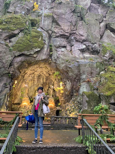 ここからポートランド名物の「グロット教会」THE GROTTOに行きます。高くそそり立った岩山の壁に空いた洞穴にキリストの像と十字架を飾って戸外のカトリックの教会に創り上げたのが1924年。「ナショナル サンクチュアリー オブ アワ ソロウフル マザー」NATIONAL SANCTUARY OF OUR SORROWFUL MOTHER 悲しみの聖母を慈しむ聖域 と言った意味で山全体を含めて62エーカーもあるそう。